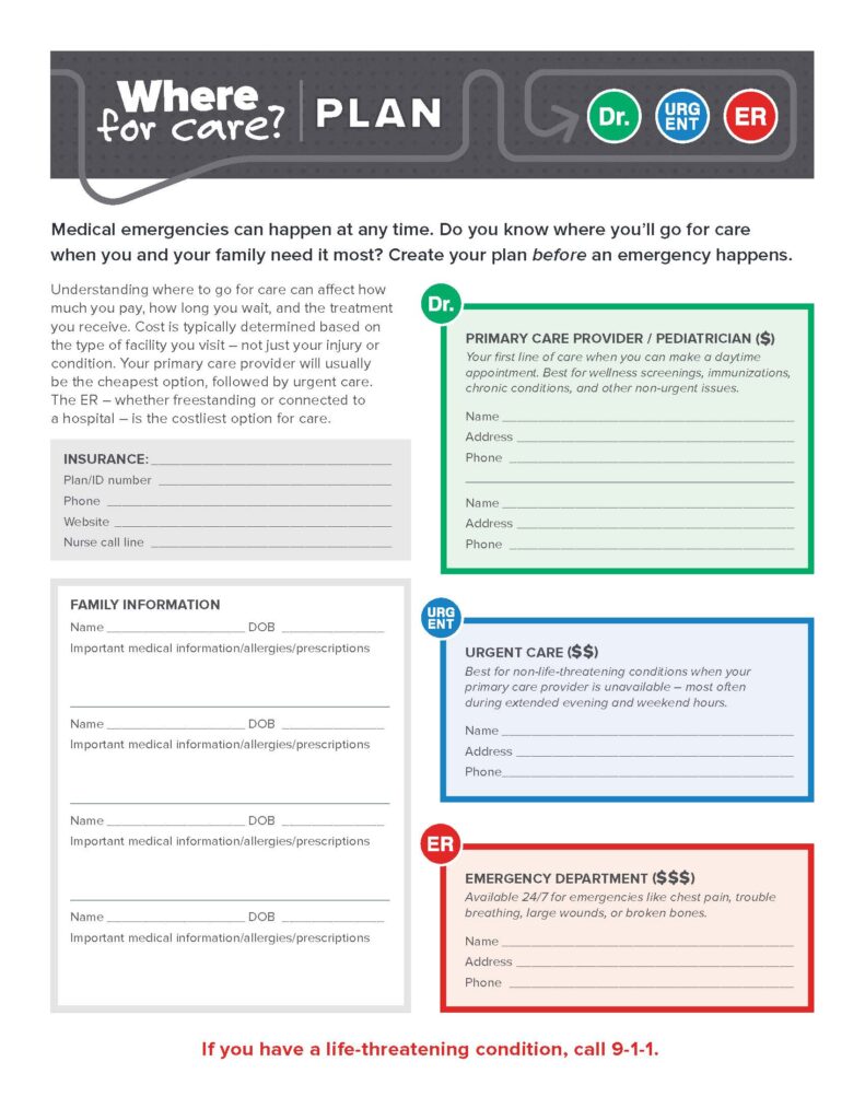 It’s important to think about where you will go for care before you need it, so that you can act quickly – especially in an emergency. Download this family care plan to make sure you and your family know where you will go for any type of unexpected health need.