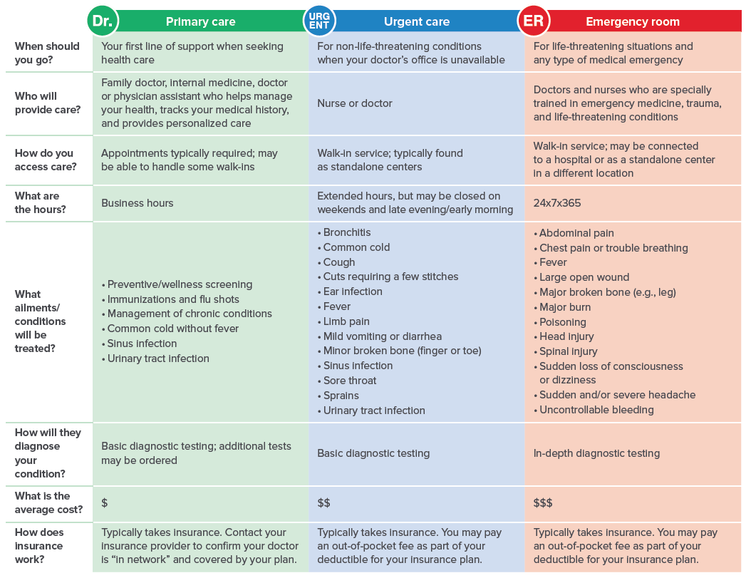 When you have an unexpected health need – whether it’s an emergency or a small pain – you must choose where to seek help. Understanding where you should go for medical care can affect how much you pay, how long you wait and the type of treatment you receive.