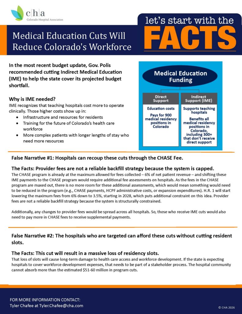 In the most recent budget update, Gov. Polis recommended cutting Indirect Medical Education (IME) to help the state cover part of its projected budget shortfall. Unfortunately, this idea – which would save the state just $18 million – would result in an additional $40 million lost in federal matching funds.